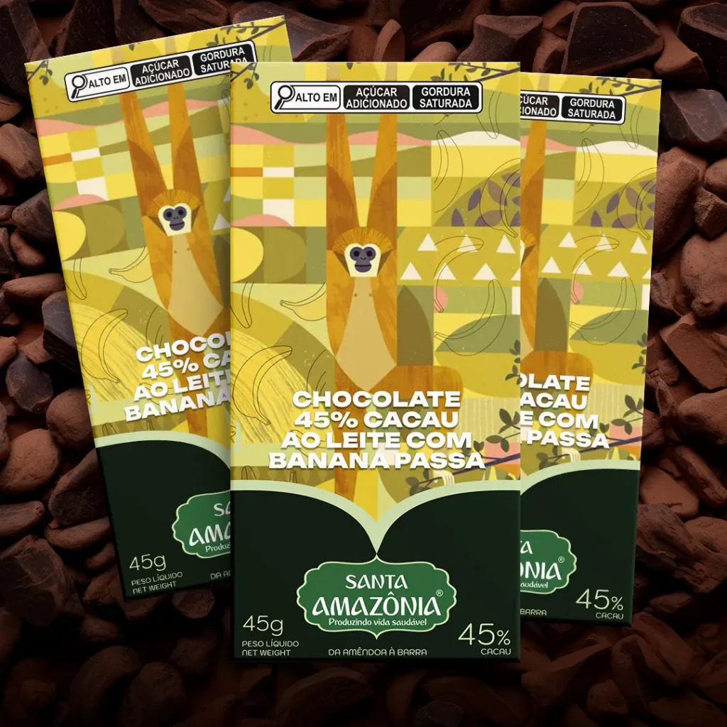 INGREDIENTES: Líquor de cacau natural, açúcar cristal, leite em pó, banana passa, manteiga de cacau, lecitina de soja e sal refinado.